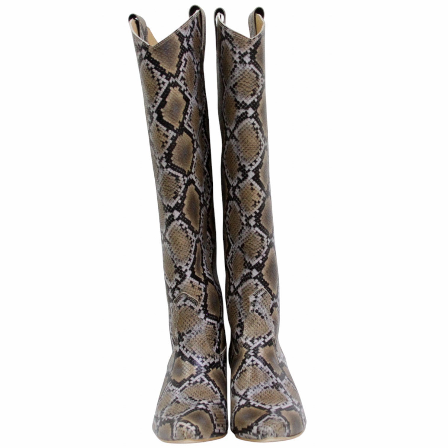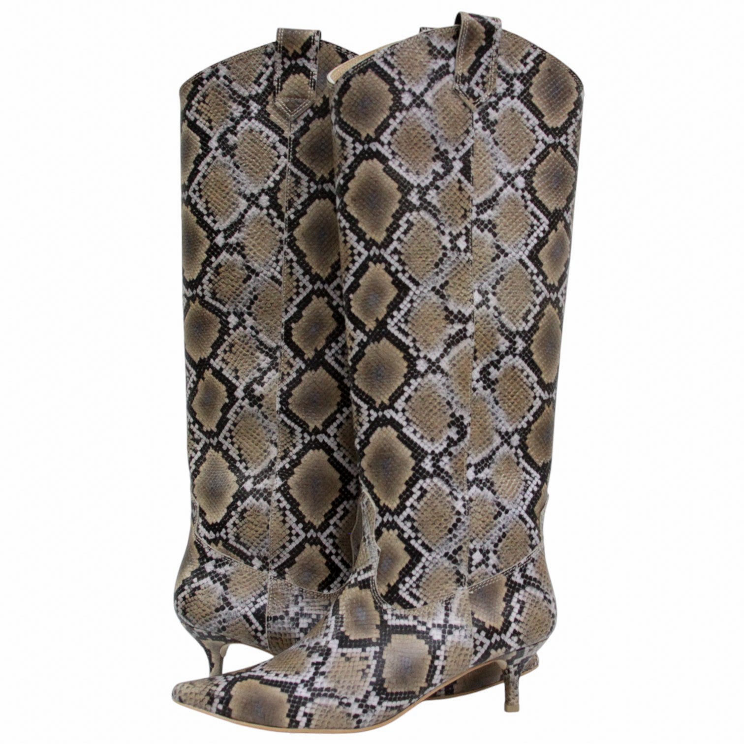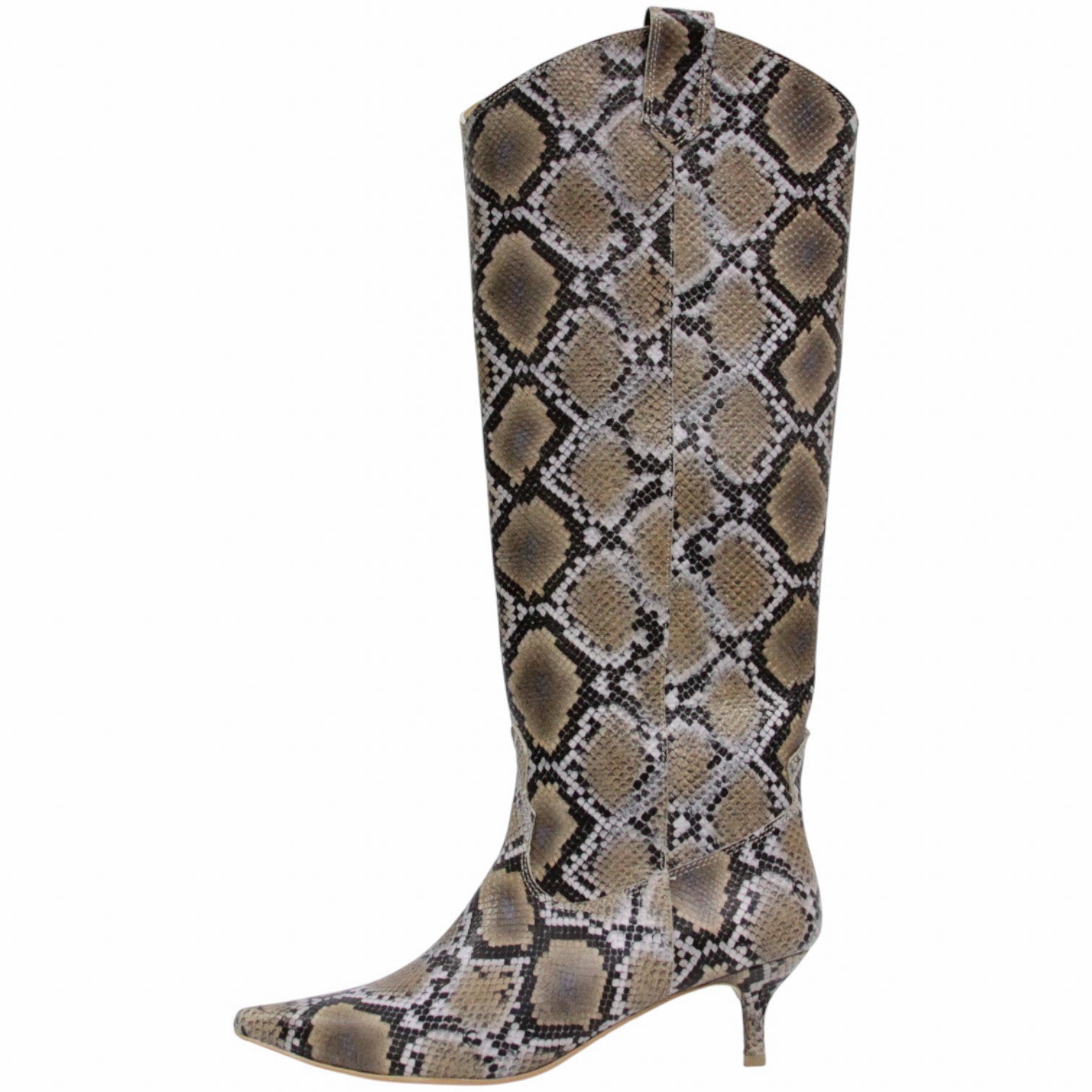 ¡Amaras bianco! Bota alta en piel con print de víbora, el básico imprescindible de esta temporada que elevará cualquier look. Su tacón tipo kitten heel de 5.5 cm combina estilo y comodidad para que las uses todo el día sin esfuerzo.