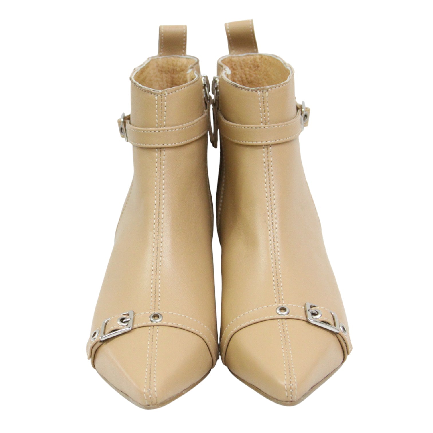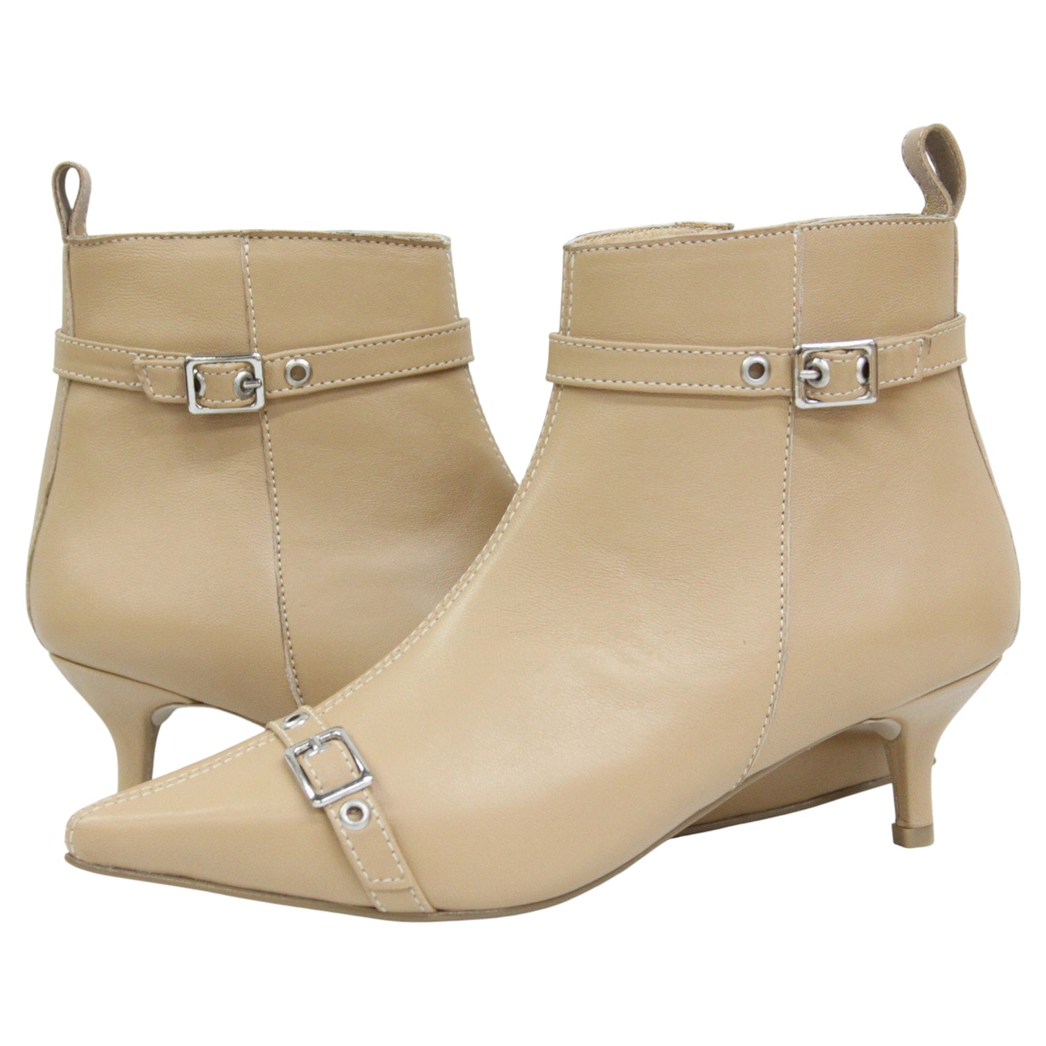 Este botín de piel lisa con acabado suave resalta por su diseño estilizado, con hebillas decorativas que le aportan un toque moderno y sofisticado.