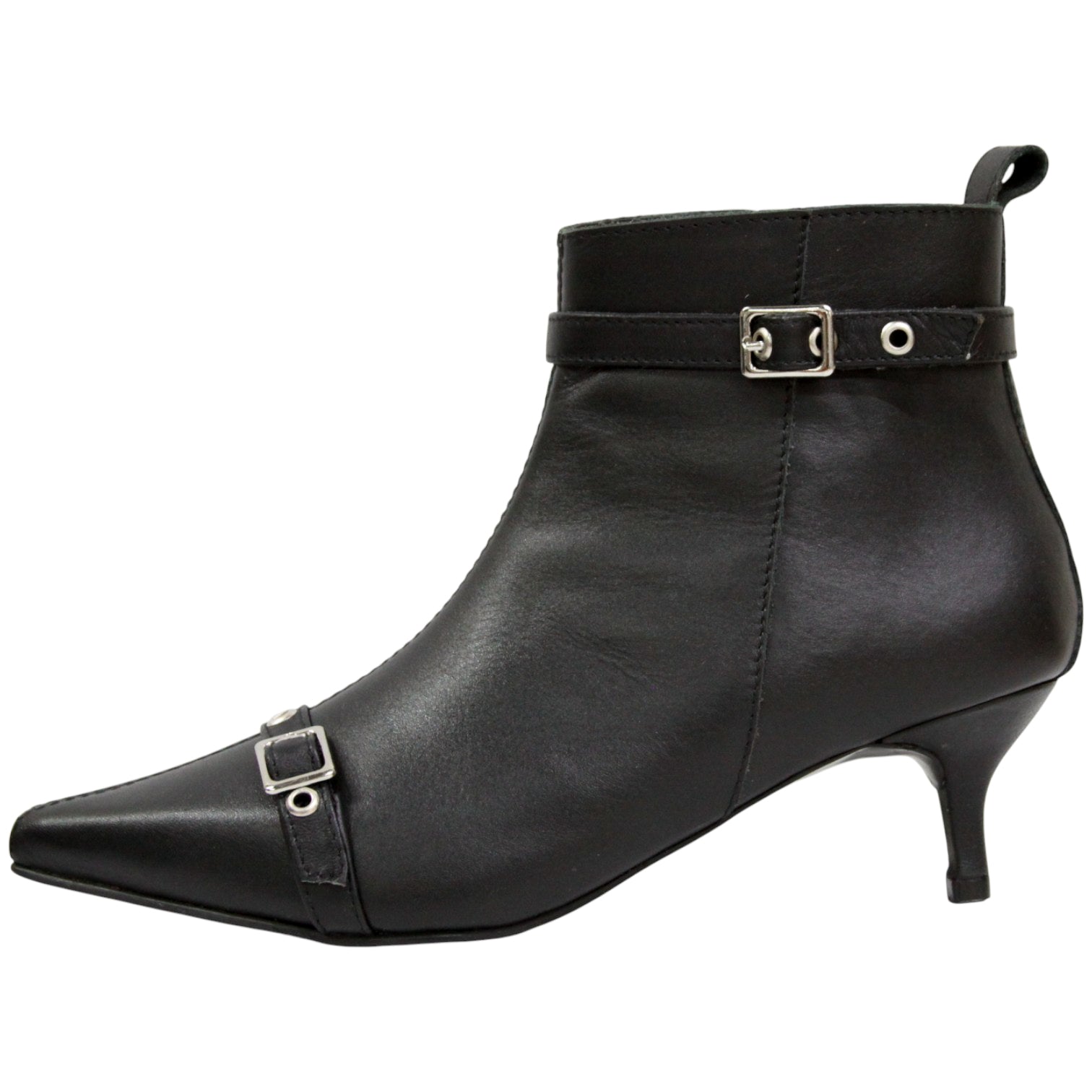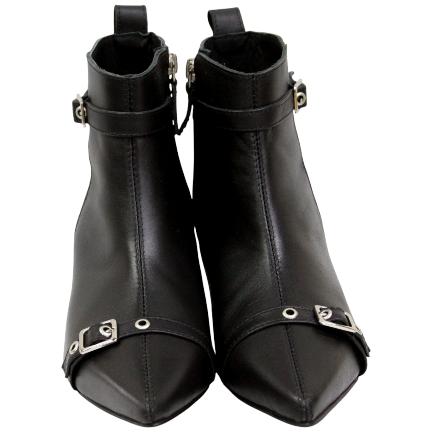 Este botín de piel lisa con acabado suave resalta por su diseño estilizado, con hebillas decorativas que le aportan un toque moderno y sofisticado.