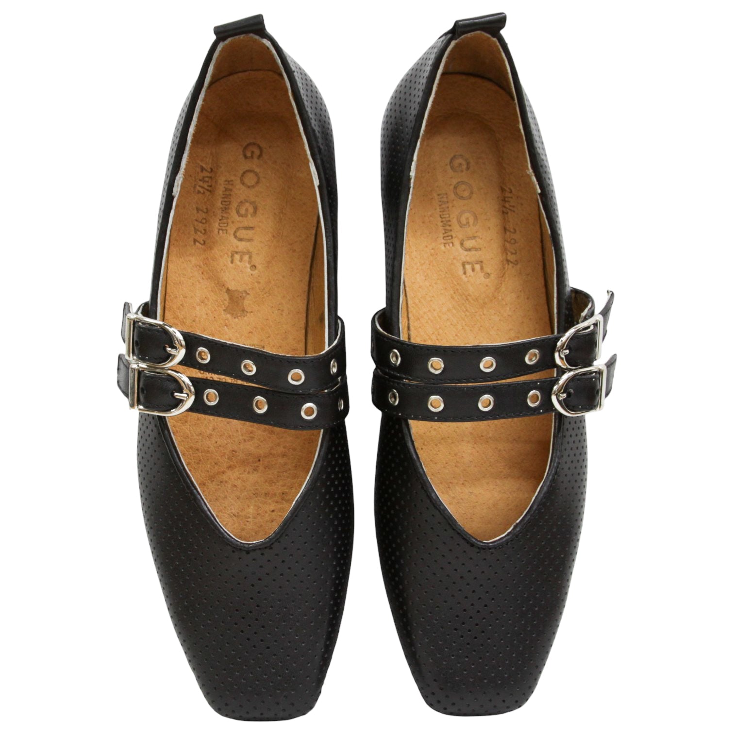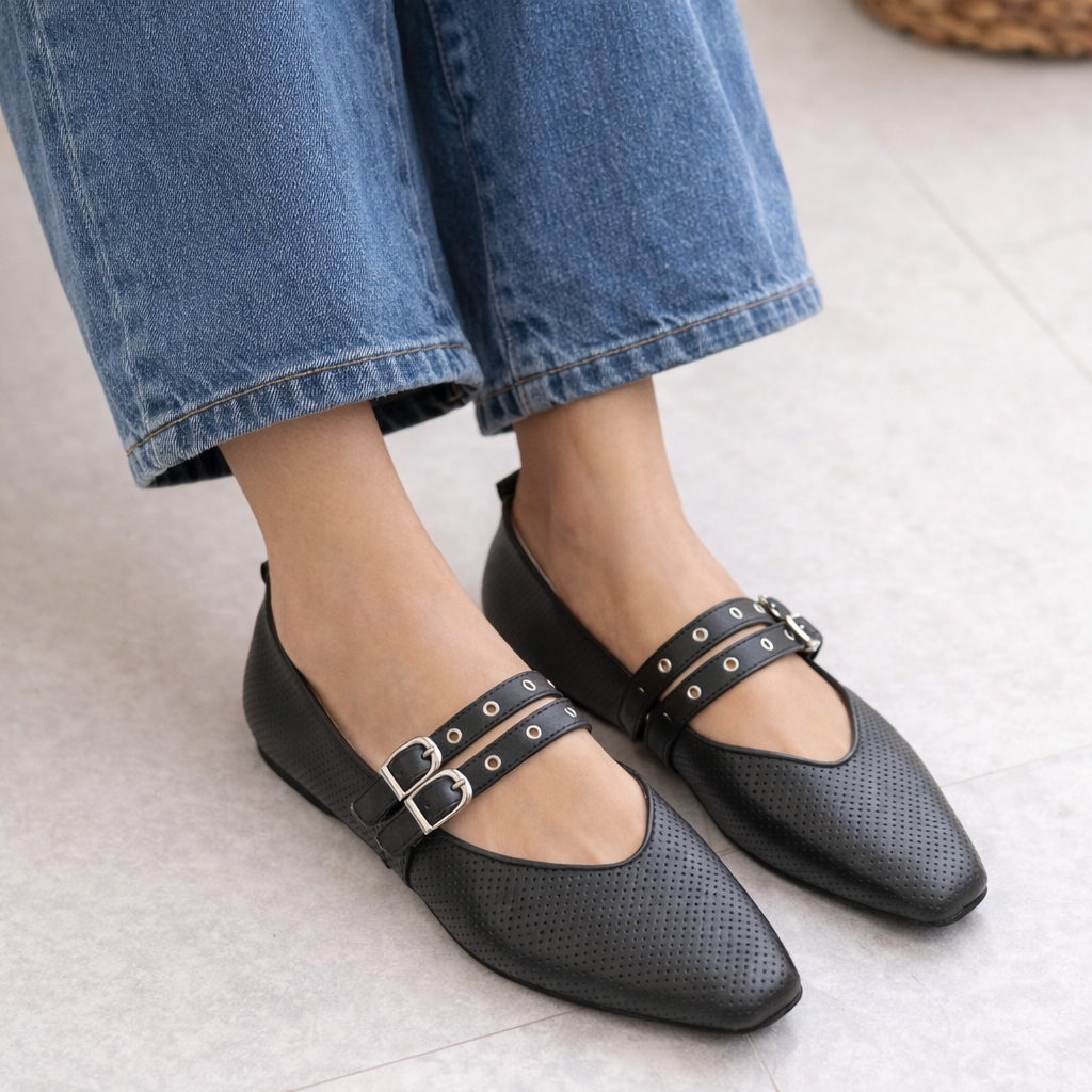 Mary Jane de diseño clásico con un giro moderno. Confeccionada en piel vacuna perforada, con doble correa ajustable y hebilla metálica para un calce cómodo y seguro. Un básico versátil para cualquier look.