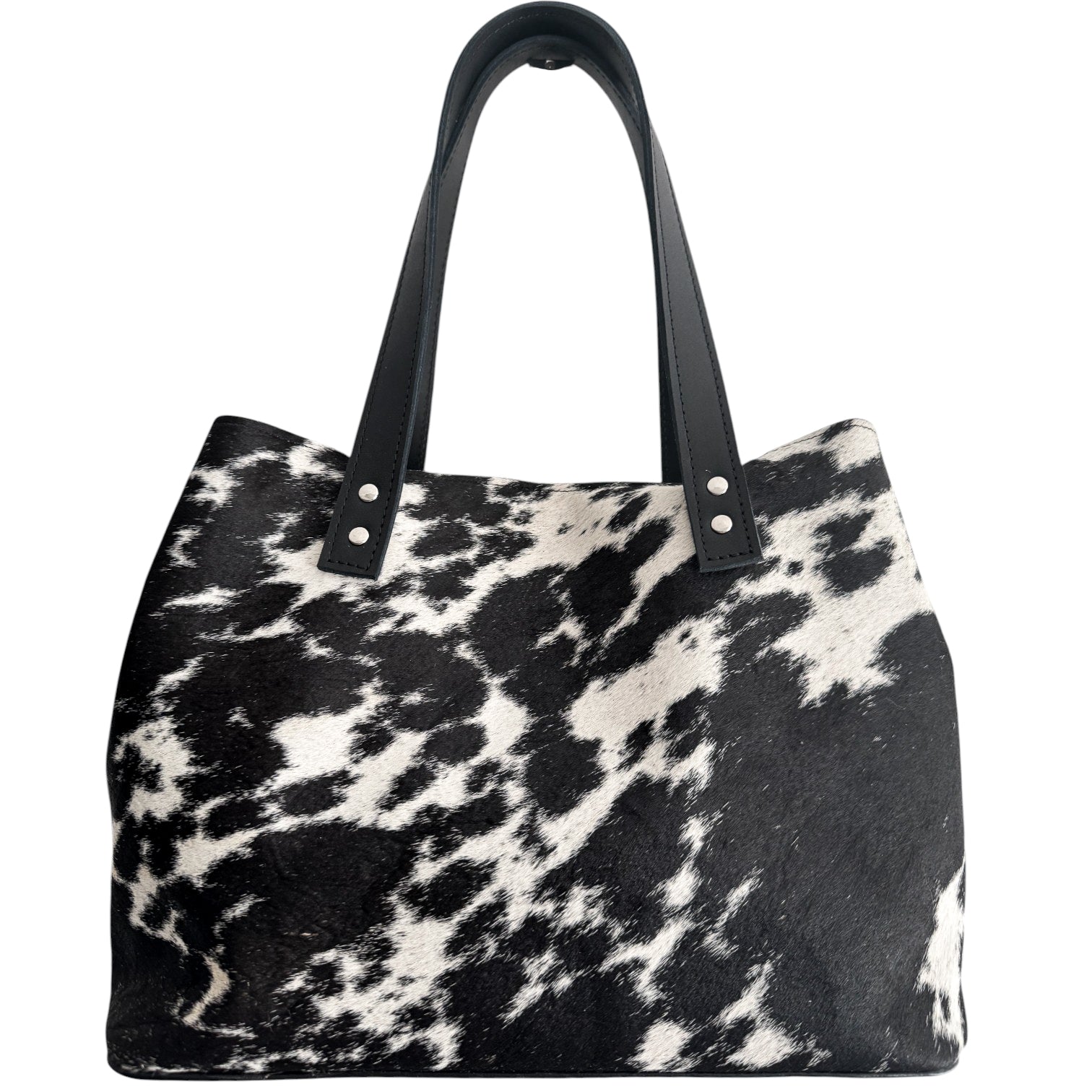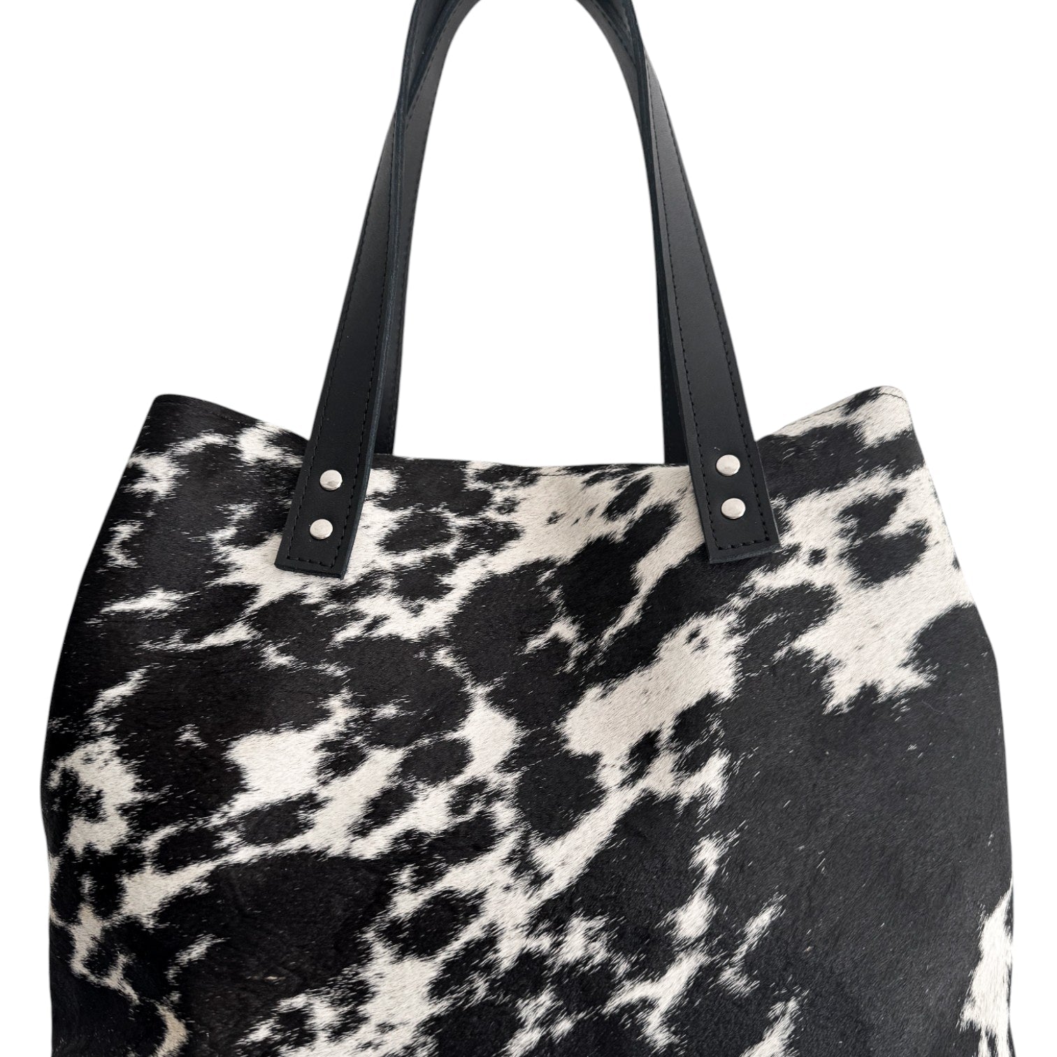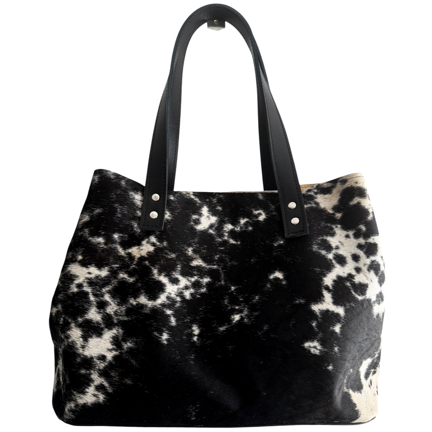 El patrón y tono de las manchas puede variar al tratarse de pelo de vaca natural — esto hace que cada bolso sea único y parte de su belleza artesanal.